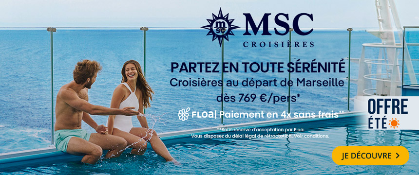 Autre compagnie exceptionnelle, MSC Croisières vous transporte à bord de ses navires modernes, haut de gamme, tels que le MSC Armonia, le MSC Lirica, le MSC Fantasia, le MSC Sinfonia, le MSC Magnifica, le MSC Poesia, le MSC Splendida… qui proposent des traversées aux quatre coins de la planète et à de nombreuses dates de départ. Profitez entre autres du MSC Aurea Spa, restaurants gastronomiques et des services club enfants à bord. Parmi les bateaux 5 étoiles de l'armateur, retrouvez le MSC Divina, le MSC Orchestra et le MSC Preziosa.
